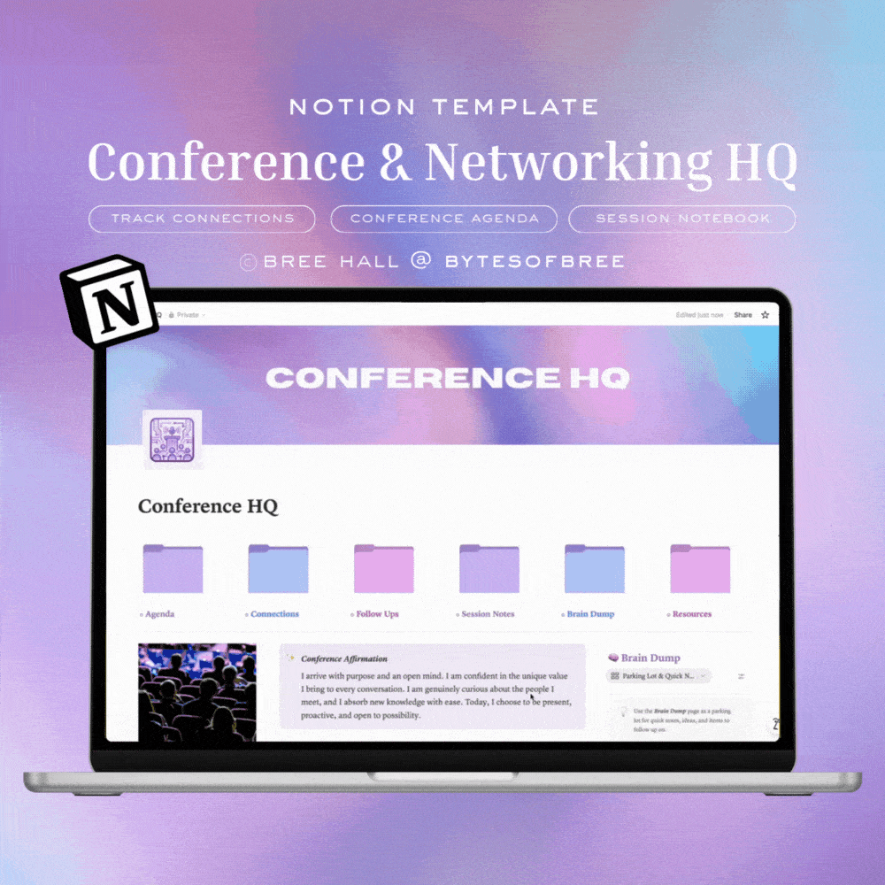 To make sure I actually follow up, I built my own Conference HQ. It’s a Notion dashboard that acts as my external brain during conferences and networking events. I track the sessions I can’t miss, quickly log every new connection (and what we actually talked about!), and organize all the resources I collect throughout the event.